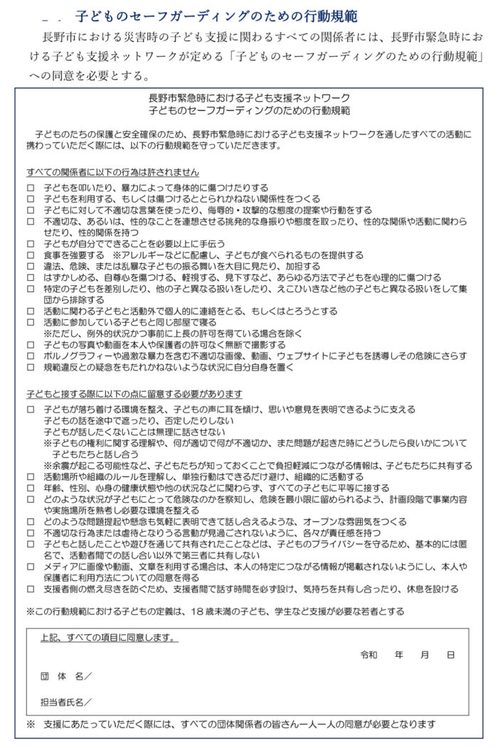 支援活動にあたっては、この行動規範を遵守することが求められ、そのことを子どもたちへ掲示などで周知し、保護者にも理解してもらうようにするのだそうです。長野市のガイドラインのなかに様式が掲載してあり(下の写真)、支援活動をするにあたってはすべての団体の関係者一人ひとりに同意・署名してもらうようにしています。支援活動中に子どもの安全にかかわることがあれば随時共有して対応し、活動後も振り返るのだそうです。