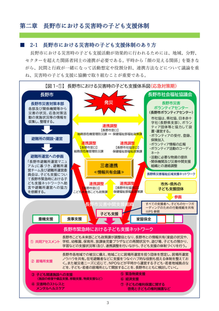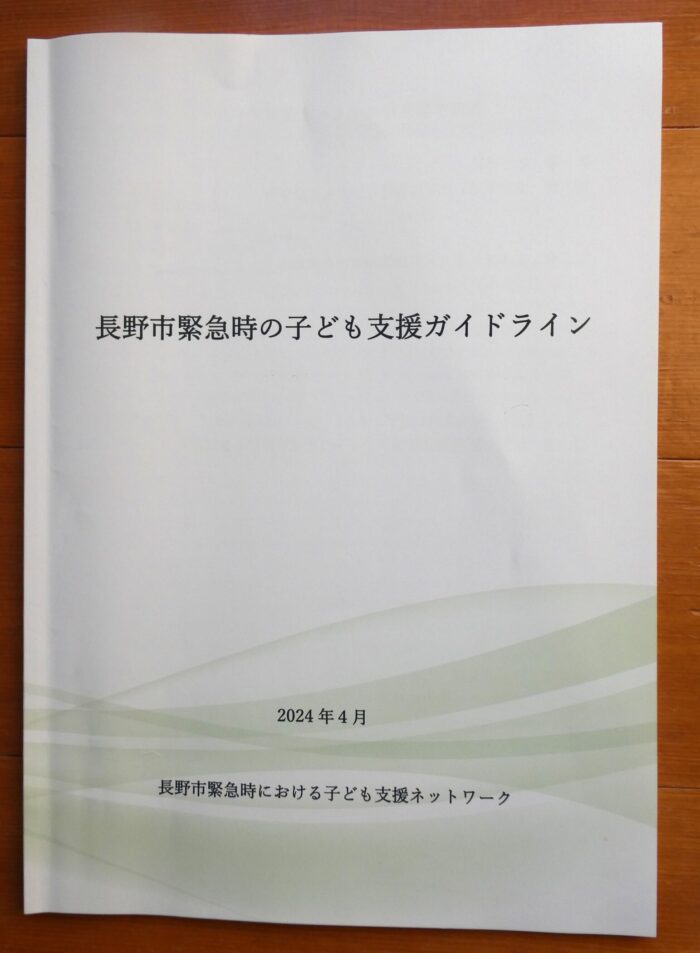 冒頭で、「長野市緊急時における子ども支援ネットワーク」が作成した「長野市緊急時の子ども支援ガイドライン」の紹介がありました。2024年4月にできたもので、A4判24ページの冊子です、支援体制、活動の留意点、特別な配慮が必要な子どもへの留意点、感染症対策、連携に向けた平時の備えなどが載っています。