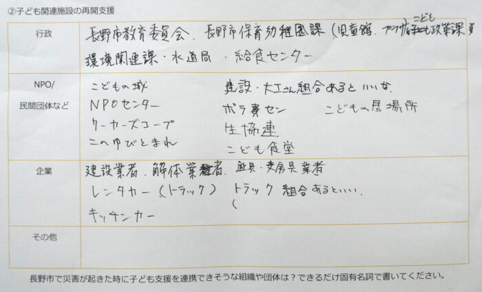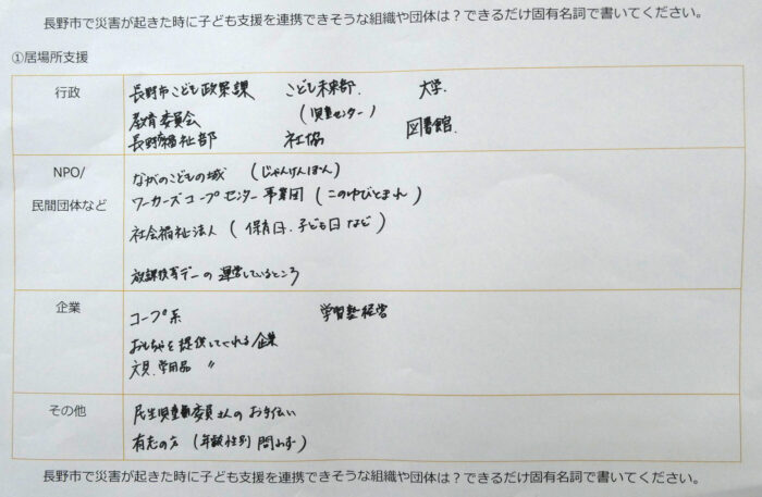 グループごとに検討する分野が示され、私が属するグループは「子どもの権利保護に関する啓発と権利擁護」でした。連携先が次々に挙げられました。長野市子ども政策課、障害福祉課、教育委員会、長野市社会福祉協議会、法務局、人権擁護委員、児童相談所、保健所、弁護士会、長野市災害ボランティア委員会、こどもの城、小中学校、保育園・幼稚園、認定こども園、児童センター・子どもプラザ、住民自治協議会、医療機関、長野市小児科医会、チャイルドライン、フードバンク信州…。
