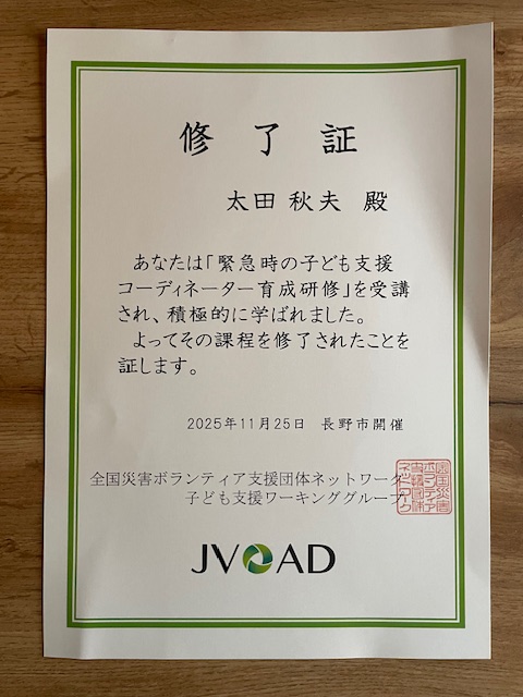 緊急時の子ども支援コーディネーター育成研修が2025年11月25日、丸一日かけて長野市で行なわれました。主催したのは「NPO法人ながのこどもの城いきいきプロジェクト」で、全国初めての開催です。講師は、全国災害ボランティア支援団体ネットワーク(JVOAD)子ども支援ワーキンググループの3名で、グループワークを取り入れながら、密度の濃い研修内容でした。