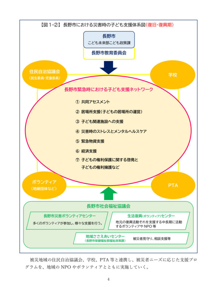 子ども支援コーディネーターは単独で動くのではなく、長野県の場合は長野県災害時支援ネットワーク(N―NET)、長野市では長野市災害ボランティア委員会や長野市社協などの災害中間支援組織の活動のなかに位置づけられ、「長野市緊急時における子ども支援ネットワーク」に属するメンバーとして活動するとことになるとの説明でした。