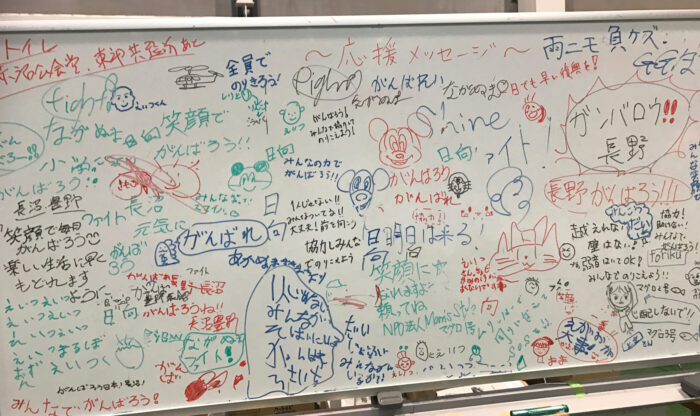 6年前の避難所を思い出しました。ホワイトボードに応援メッセージを書き込みお互いに励まし合いましたが、子どもたちもそこに頑張って乗り越える気持ちを書き込んでいました。自分の内面的な力で困難に打ち勝とうとしていたのです。