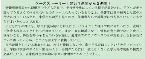 避難所における子どもたちの様子がリアルに示されていて、在宅避難している家庭からの要望も含まれています。7つの分野の支援活動を、どのように具体的に進めるかを考えてみるのです。