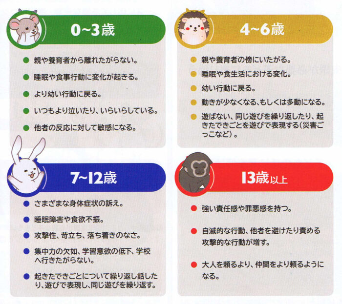 年齢ごとに示されるストレス反応の詳しい説明があり、この症状を知っていることの大切さを感じさせられました。