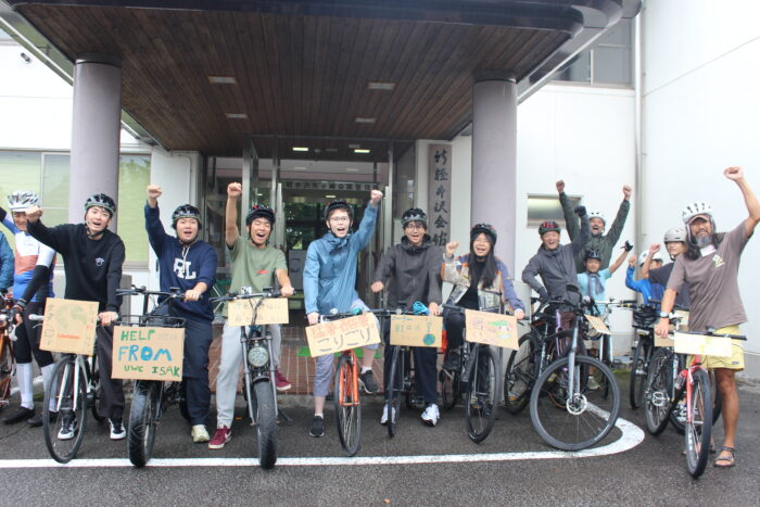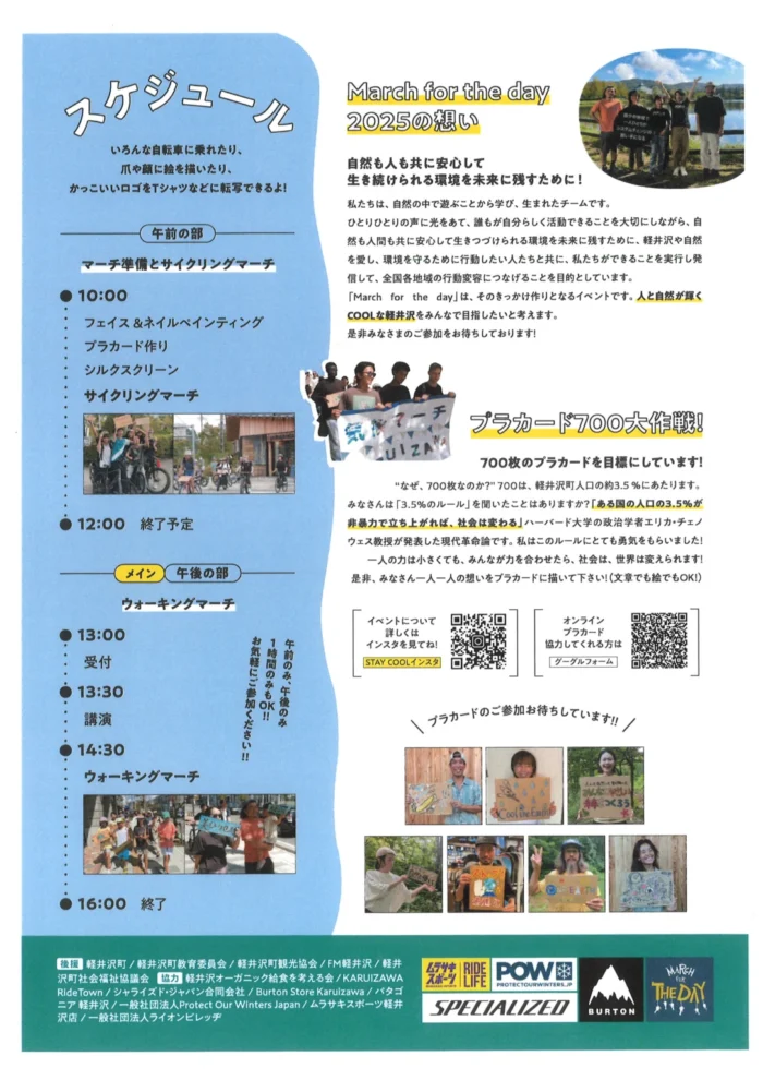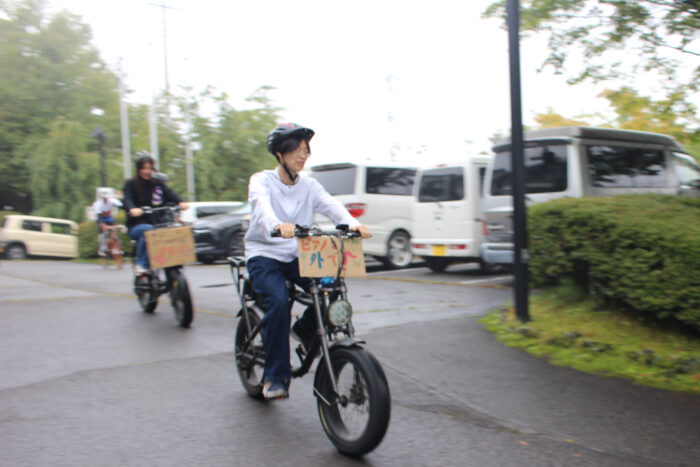 プラカードを作り終わると、希望者はサイクリングマーチに出かけました。サイクリングマーチとはウォーキングマーチの自転車版のこと。町内のスポーツ用品店が提供(貸出)したE-BIKEに乗った参加者は、軽井沢・プリンスショッピングプラザ方面や旧軽銀座方面など、2回にわたって町に繰り出していました。