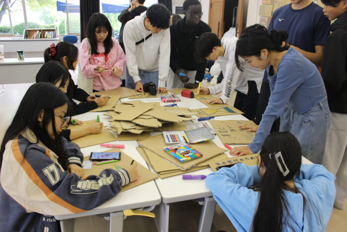 午前の部ではまず、ウォーキングマーチで使用するプラカードを作っていました。「プラ」カードと言っても実際は段ボールを使用し、環境に配慮しています。