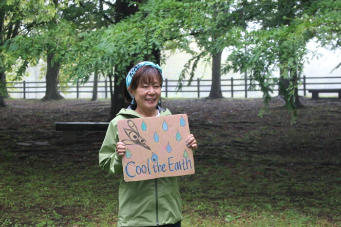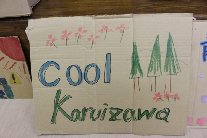 参加者は思い思いのメッセージをプラカードに書き、好きな色を塗っていきます。なかでも印象的だったのが「軽井沢町が暑くなっている」という趣旨のメッセージ。かつてはクーラーを設置していなかった家屋が多かったそうですが、近年は増えてきているとのことです。実際、参加者(学生)に聞くと「学校の寮にはクーラーがなく、暑くて我慢できないためうちわを使っている」と話していました。