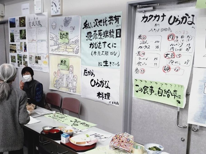 長年、生活改善や食農教育などに関わって「信州ひらがな料理普及隊」の結成を働きかけ現在、事務局を務める池田玲子さんの展示は「だから、ひらがな料理がいい」と呼び掛けたもの。