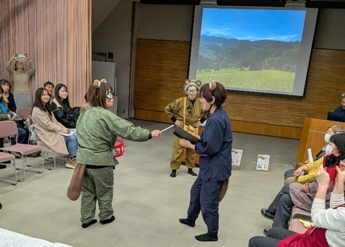 信州の食文化や農村文化を演劇で伝える「食育劇団えぇ~こ」は、『信濃では今日も明日も明後日も 作って食べて伝えてぽんぽこ』と題し、冬至のかぼちゃやお盆のおやきなど、昔ながらの郷土の食を何とか残し伝えようとする3匹のたぬきの楽しいやりとりを熱演しました。