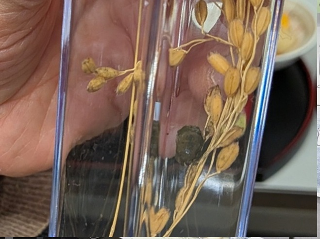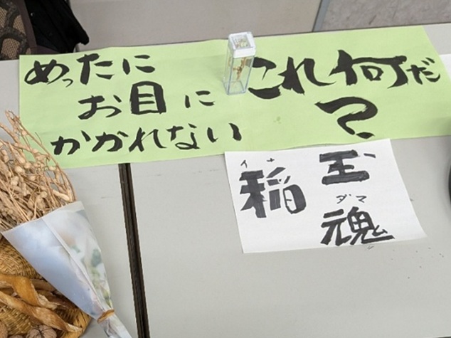 稲穂についた黒い玉(写真左)は、「めったにお目にかかれない稲魂(いなだま)」。麹のもとになる「コウジカビ」の塊で、日本の発酵文化の原点ともいえる存在です。昔は「稲糀病」といわれて嫌われていたそうですが、近年は農薬散布などのため、ほとんど見ることができなくなったそうです。ちなみに、「麹」は古代中国から伝わった漢字ですが、「糀」は江戸時代にできた和製漢字で特に米糀を指すそうです。
