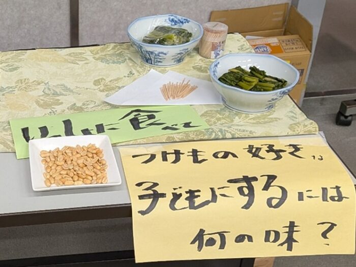 「いっしょに食べて」と並んでいたのは野沢菜と落花生。「つけもの好きな子どもにするには何の味?」と添えられていました。野沢菜と落花生をいっしょに食べると、鳥のキジを思わせるような旨味が感じられるといいます。