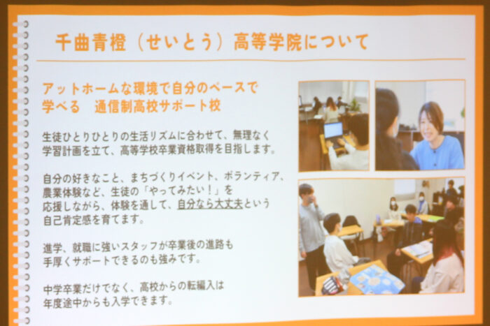 2025年4月にオレンジファムは、通信制高校のサポート校「千曲青橙高等学院」を開校しました。年齢を問わず入学できるこの学校は「再挑戦の場」となっています。経済的な理由や距離の問題で長野市・上田市の通信制高校に通えなかった若者や、病気などで進学を一度諦めた人が高卒資格の取得に再挑戦できる場です。