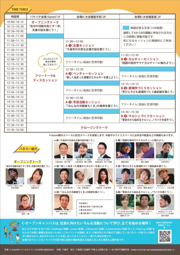 C-OPEN CAMPUSは千曲市(一部、周辺自治体を含む)で活動する市民団体や企業がこれまでの成果を発表する場です。登壇者が所属する団体の形式はさまざまでNPO法人や一般社団法人、株式会社や経営者団体(ライオンズクラブ)まで多種多様な意見が一日で聞ける貴重なイベントでした。