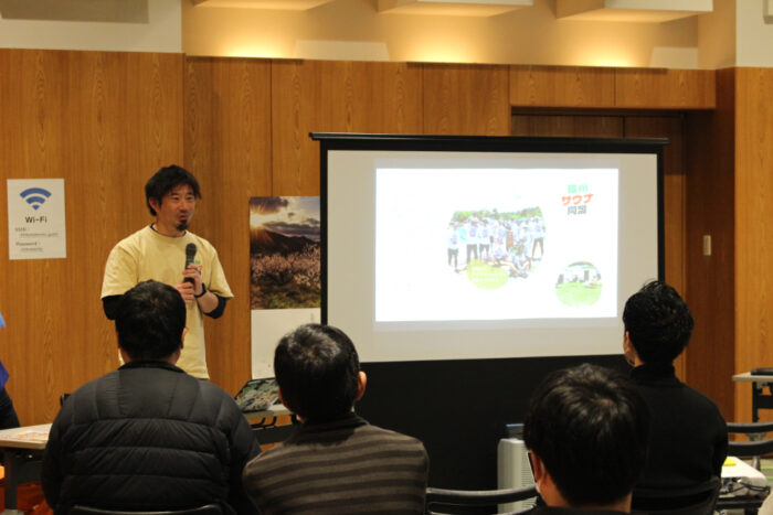 信州サウナ同盟でも登場した「一般社団法人オレンジファム」の講演もありました。登壇者は代表の中島壮太さん、副代表の飯島真紀子さん、そしてイベントスタッフの小松太陽さんです。中島さんのファシリテーションで講演は進みました。